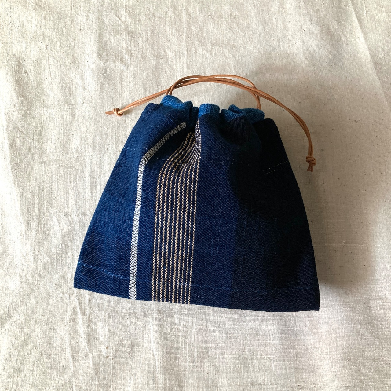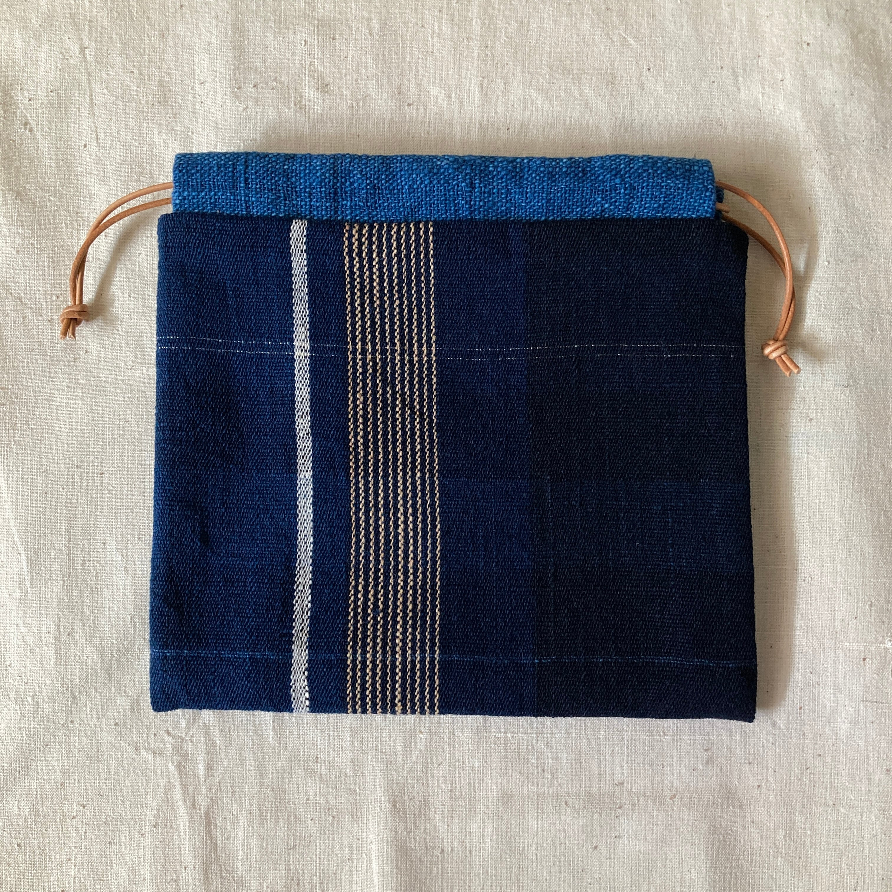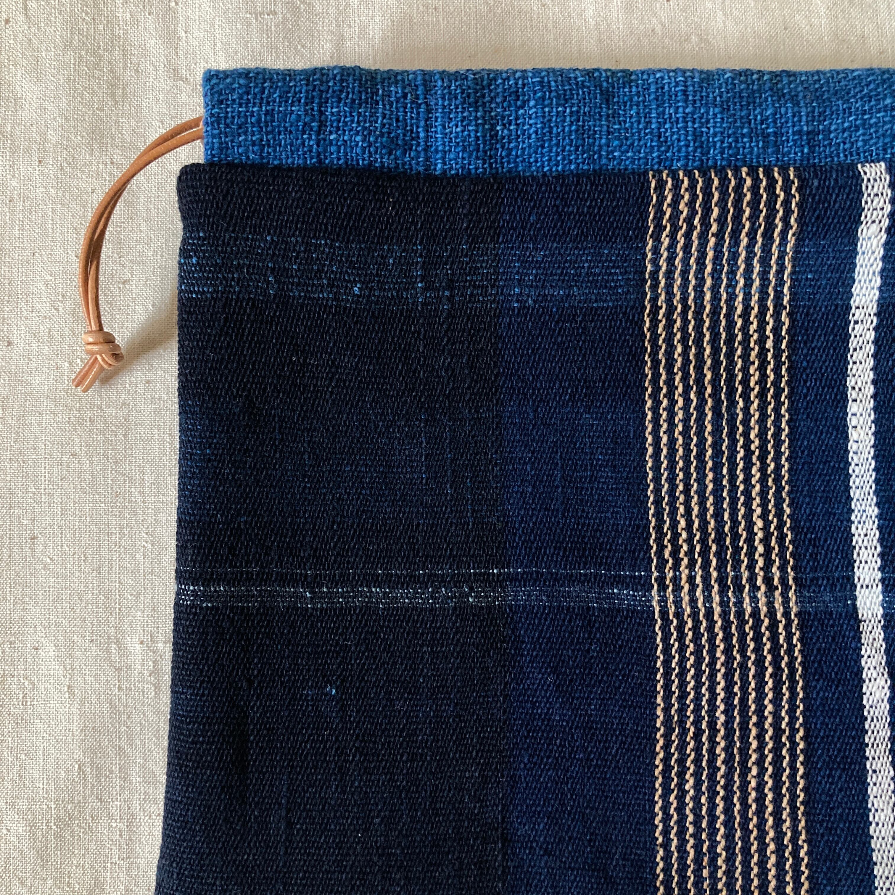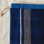 巾着 手紡ぎ木綿・手織り 藍地縦縞