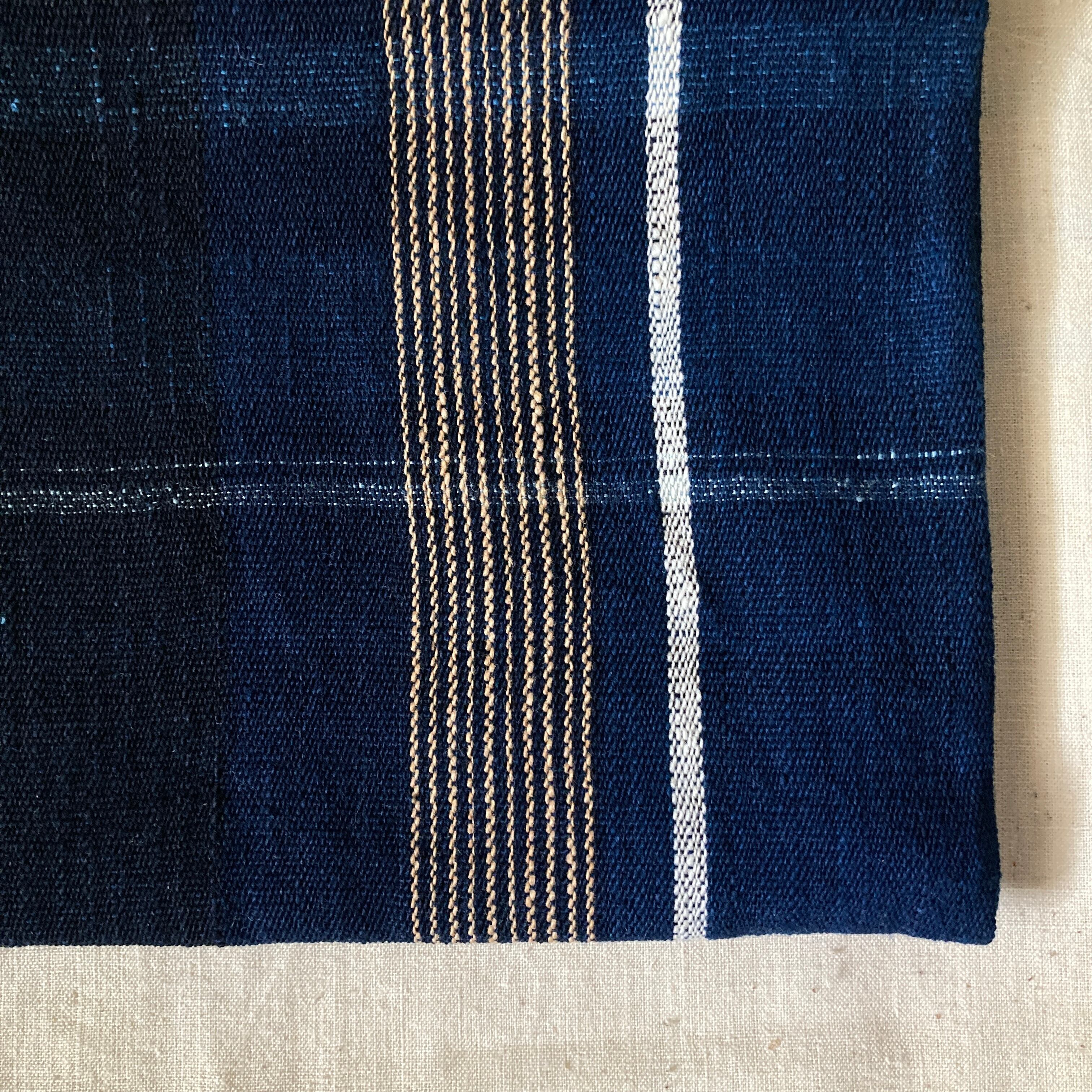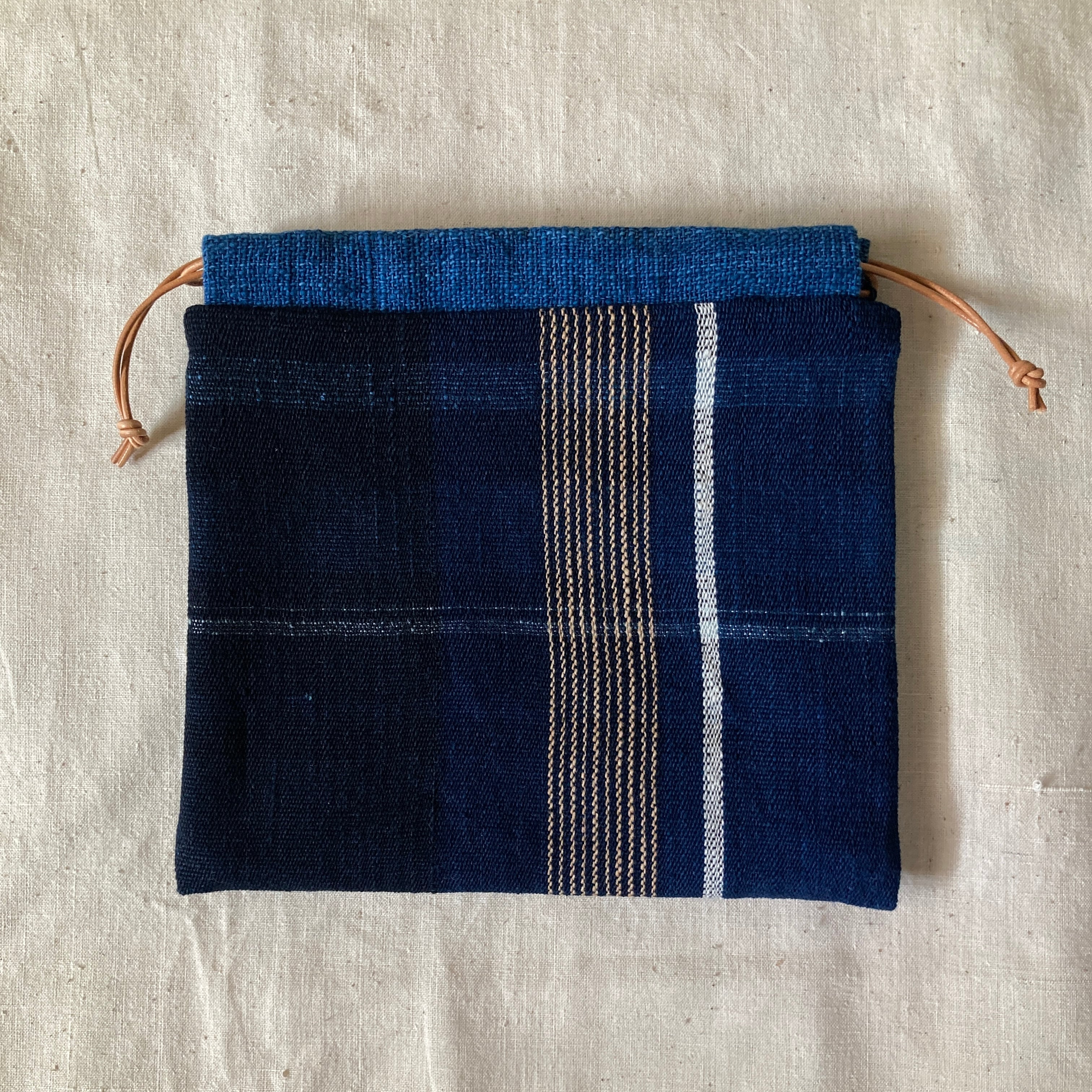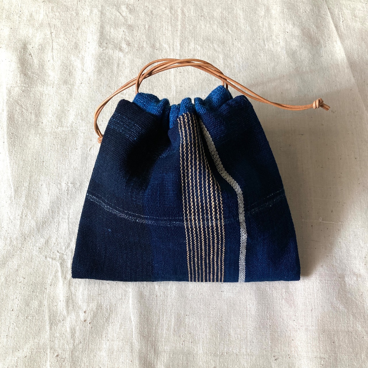 巾着 手紡ぎ木綿・手織り 藍地縦縞