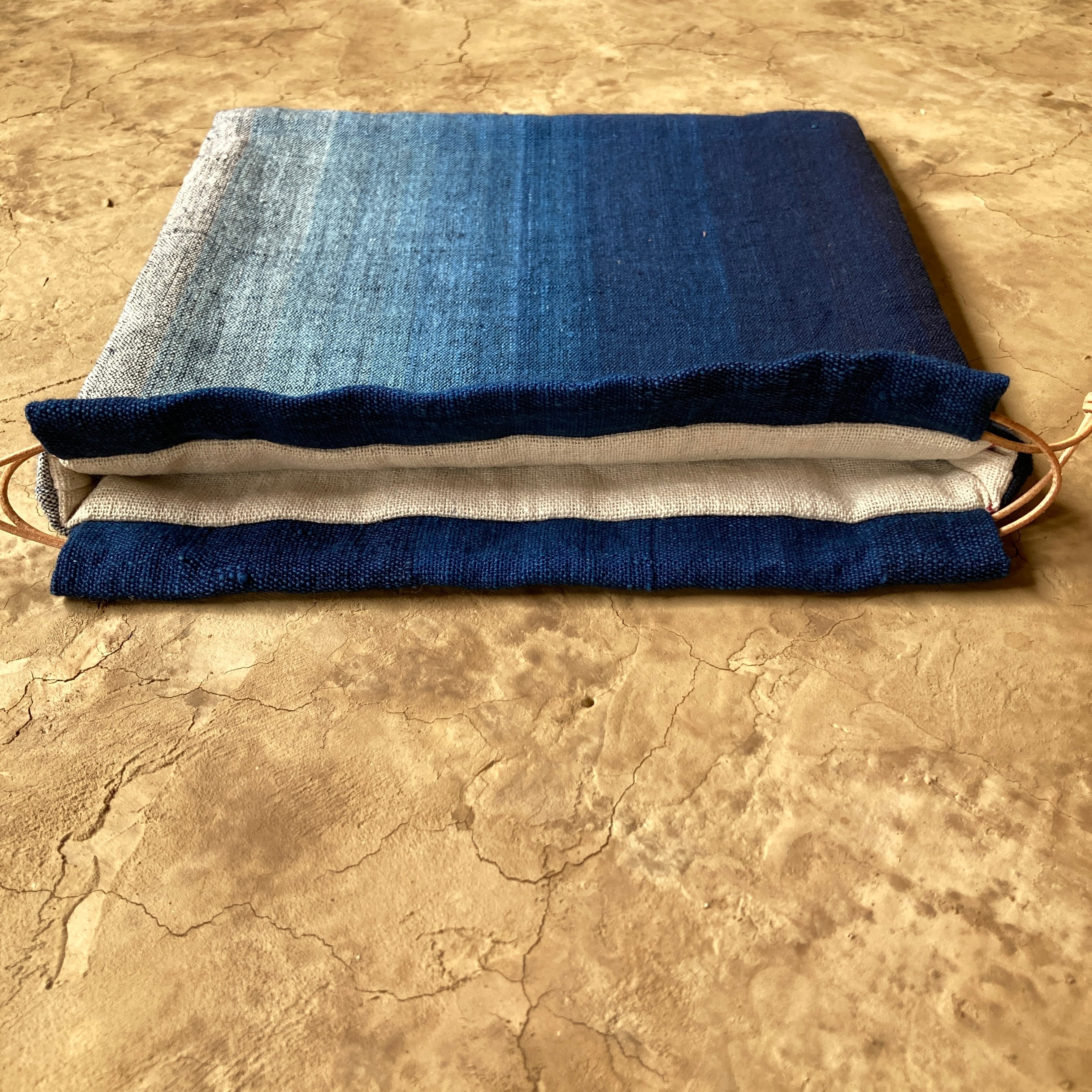 ・裏布はインドの手紡ぎ手織り綿布、紐通し口は播磨藍染の自家織り手紡ぎ手織り綿布を使用しています